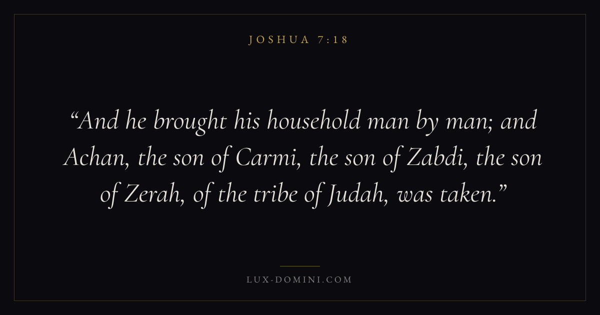 And he brought his household man by man; and Achan, the son of Carmi, the son of Zabdi, the son of Zerah, of the tribe of Judah, was taken.