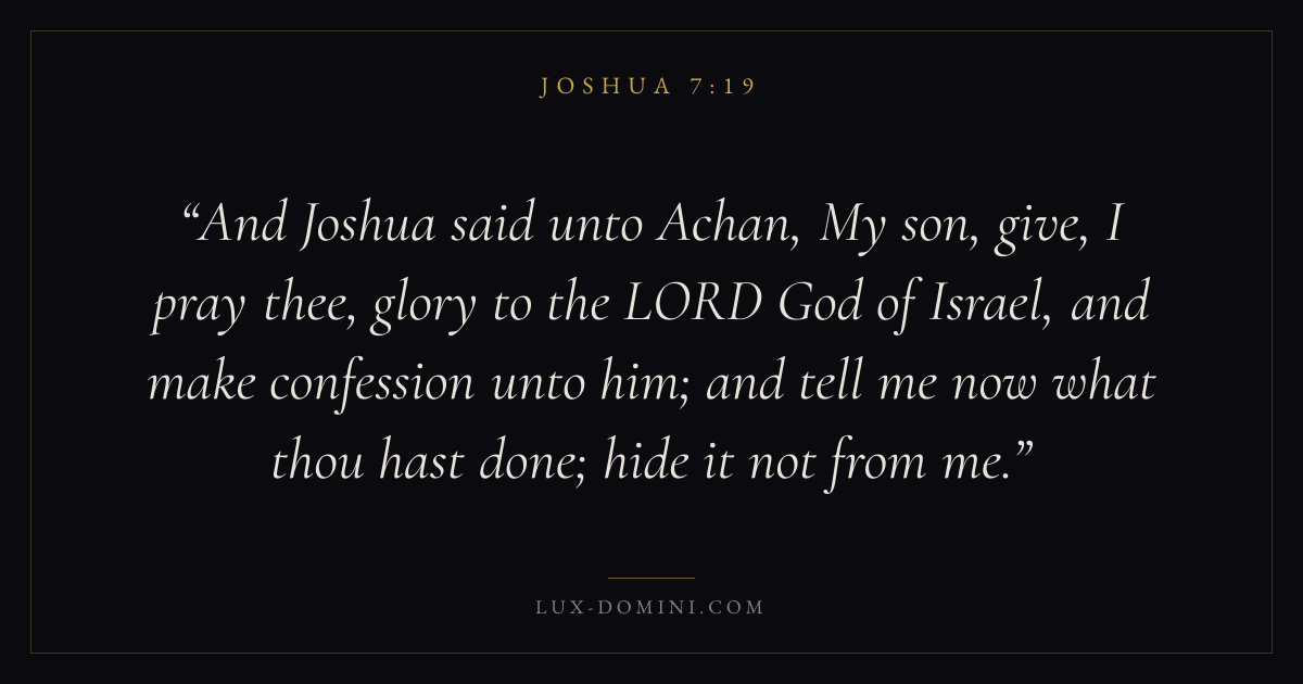 And Joshua said unto Achan, My son, give, I pray thee, glory to the LORD God of Israel, and make confession unto him; and tell me now what thou hast done; hide it not from me.