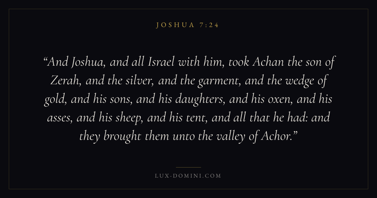 And Joshua, and all Israel with him, took Achan the son of Zerah, and the silver, and the garment, and the wedge of gold, and his sons, and his daughters, and his oxen, and his asses, and his sheep, and his tent, and all that he had: and they brought them unto the valley of Achor.