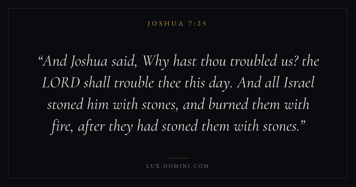 And Joshua said, Why hast thou troubled us? the LORD shall trouble thee this day. And all Israel stoned him with stones, and burned them with fire, after they had stoned them with stones.