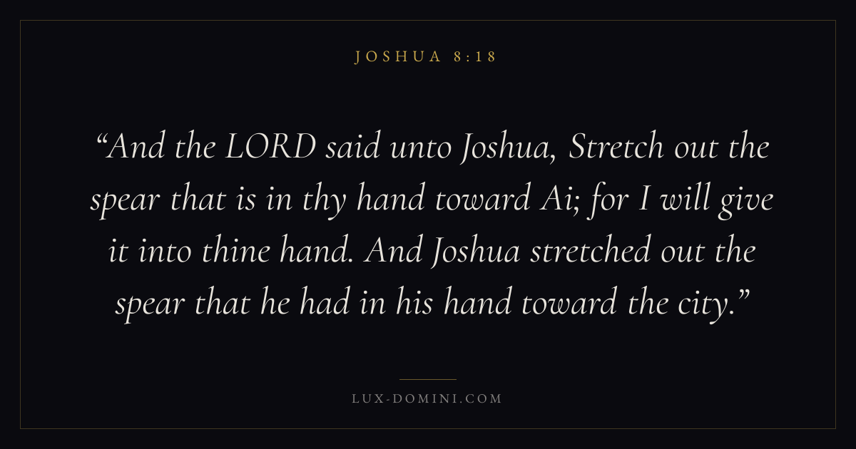 And the LORD said unto Joshua, Stretch out the spear that is in thy hand toward Ai; for I will give it into thine hand. And Joshua stretched out the spear that he had in his hand toward the city.