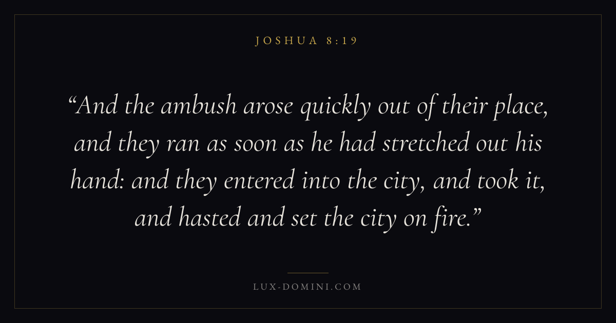 And the ambush arose quickly out of their place, and they ran as soon as he had stretched out his hand: and they entered into the city, and took it, and hasted and set the city on fire.