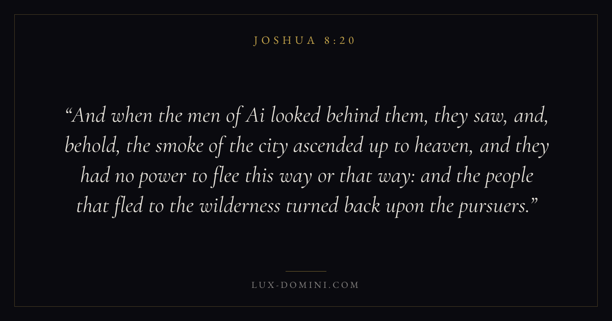 And when the men of Ai looked behind them, they saw, and, behold, the smoke of the city ascended up to heaven, and they had no power to flee this way or that way: and the people that fled to the wilderness turned back upon the pursuers.
