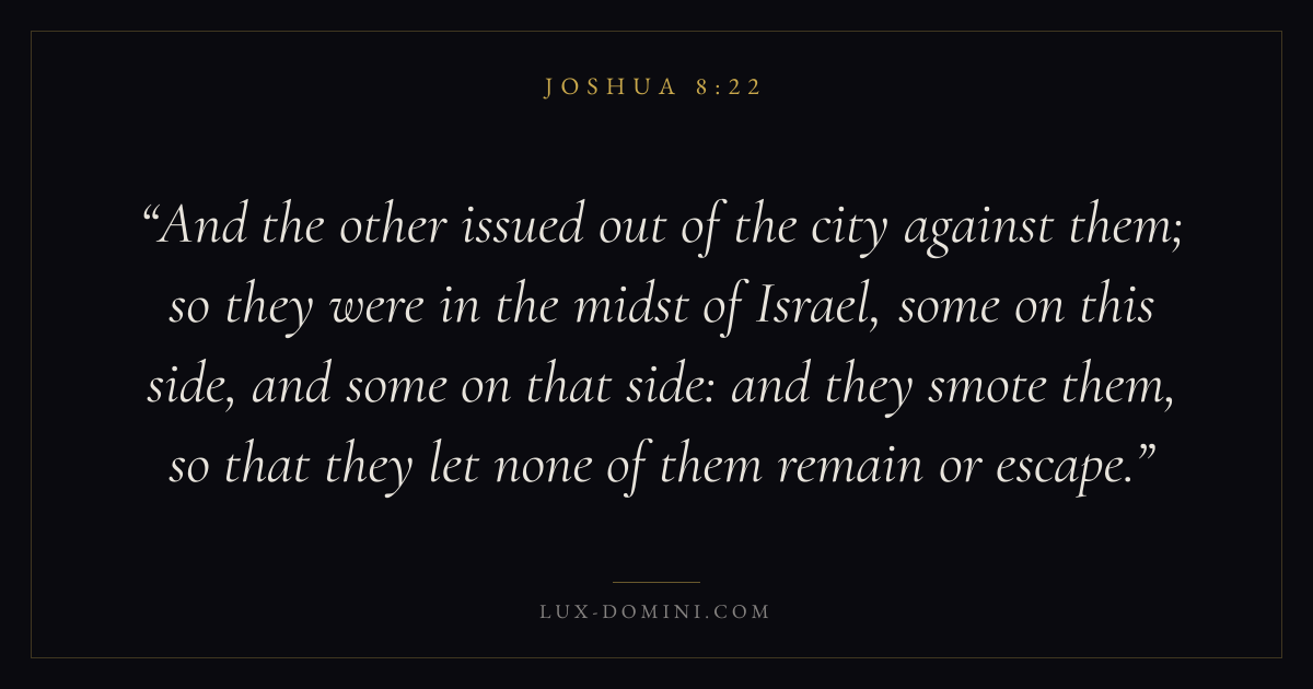 And the other issued out of the city against them; so they were in the midst of Israel, some on this side, and some on that side: and they smote them, so that they let none of them remain or escape.