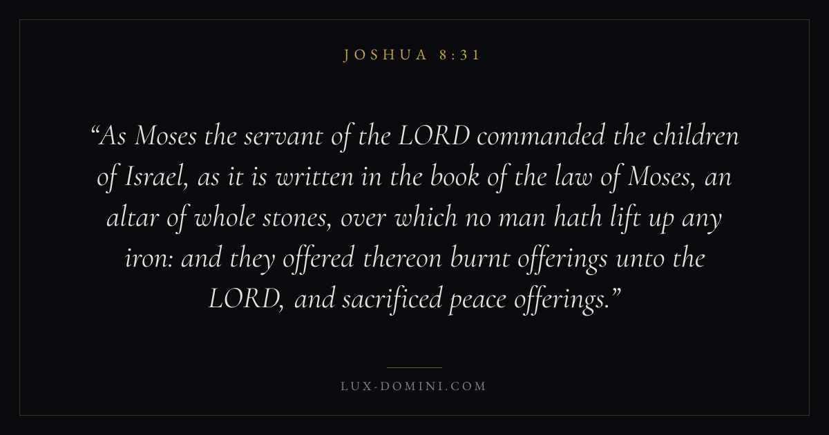 As Moses the servant of the LORD commanded the children of Israel, as it is written in the book of the law of Moses, an altar of whole stones, over which no man hath lift up any iron: and they offered thereon burnt offerings unto the LORD, and sacrificed peace offerings.