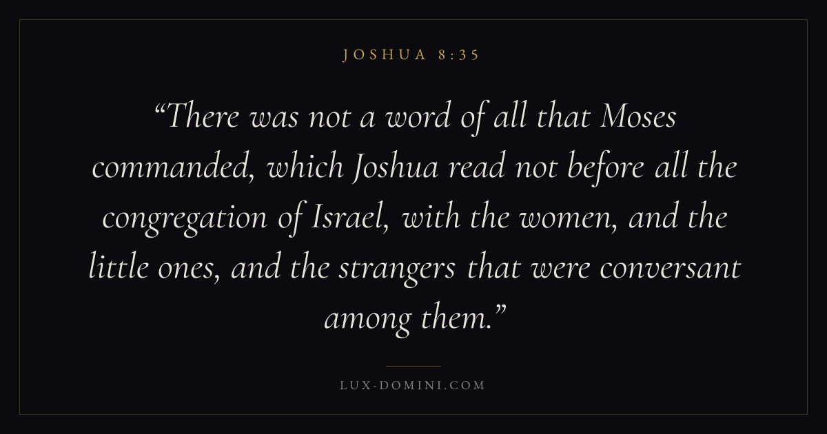 There was not a word of all that Moses commanded, which Joshua read not before all the congregation of Israel, with the women, and the little ones, and the strangers that were conversant among them.