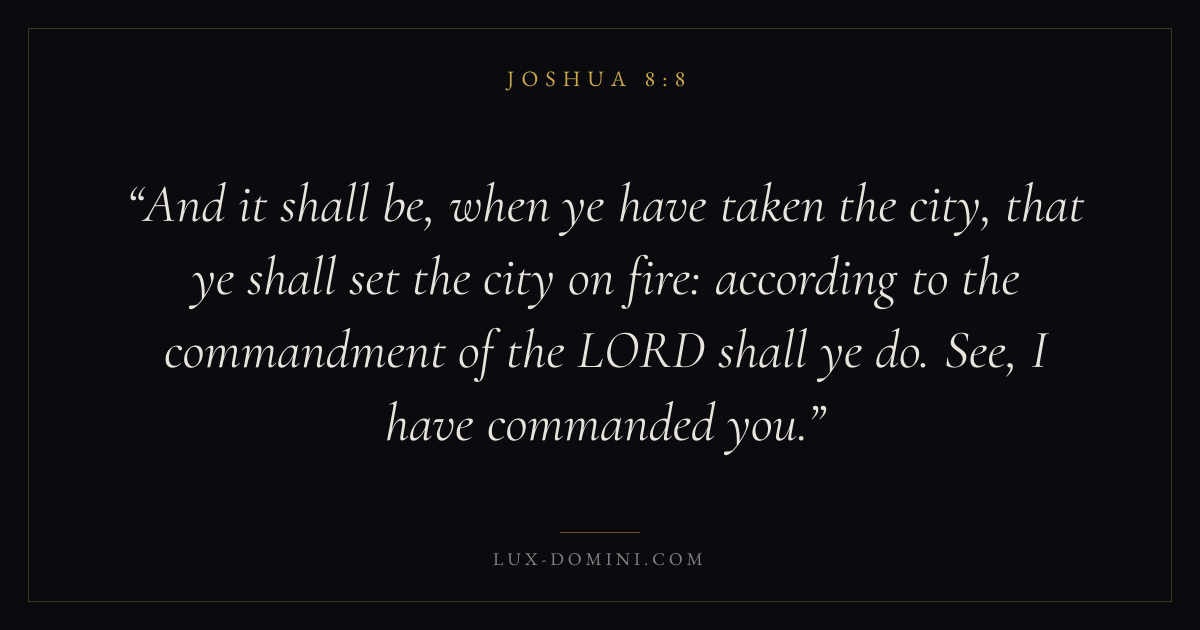 And it shall be, when ye have taken the city, that ye shall set the city on fire: according to the commandment of the LORD shall ye do. See, I have commanded you.