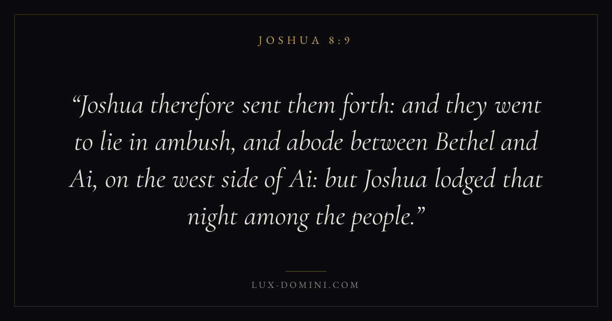 Joshua therefore sent them forth: and they went to lie in ambush, and abode between Bethel and Ai, on the west side of Ai: but Joshua lodged that night among the people.