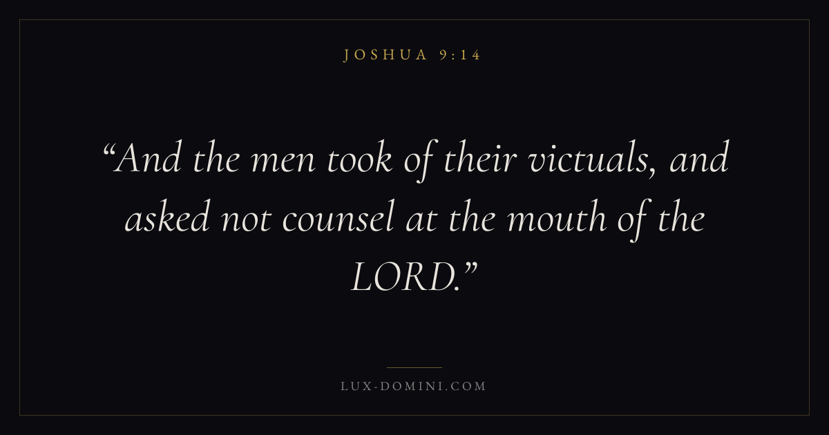 Books / Joshua / Chapter 9 / Verse 14 ← Joshua 9:13 Joshua 9:14 Joshua 9:15 → And the men took of their victuals, and asked not counsel at the mouth of the LORD. Download verse card Share on Twitter Share on Facebook Pin it ✦ Key themes PrayerPeaceTruthInheritance Read with Joshua 9:12Joshua 9:13Matthew 6:9Luke 18:1 Related topics Bible verses about prayerBible verses about peaceBible verses about truth ✦ Joshua Chapter 9 verses V. 1 V. 2 V. 3 V. 4 V. 5 V. 6 V. 7 V. 8 V. 9 V. 10 V. 11 V. 12 V. 13 V. 14 V. 15 V. 16 V. 17 V. 18 V. 19 V. 20 V. 21 V. 22 V. 23 V. 24 V. 25 V. 26 V. 27