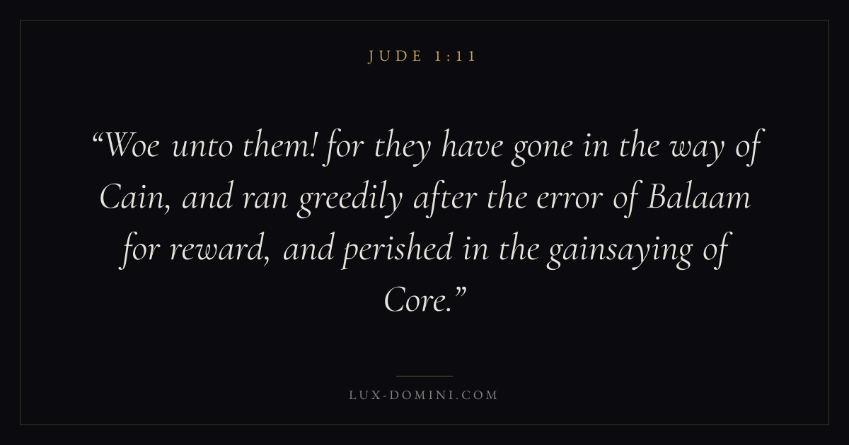 Woe unto them! for they have gone in the way of Cain, and ran greedily after the error of Balaam for reward, and perished in the gainsaying of Core.