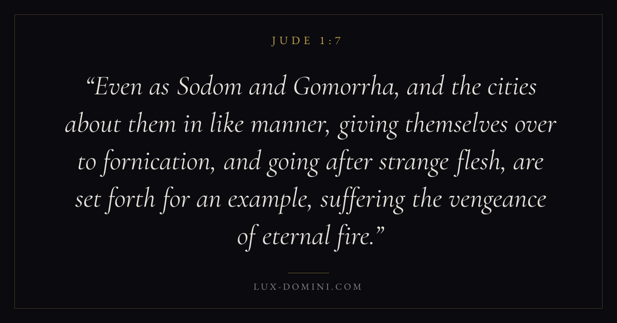 Even as Sodom and Gomorrha, and the cities about them in like manner, giving themselves over to fornication, and going after strange flesh, are set forth for an example, suffering the vengeance of eternal fire.