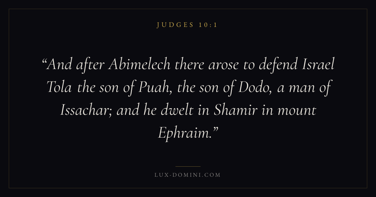 And after Abimelech there arose to defend Israel Tola the son of Puah, the son of Dodo, a man of Issachar; and he dwelt in Shamir in mount Ephraim.