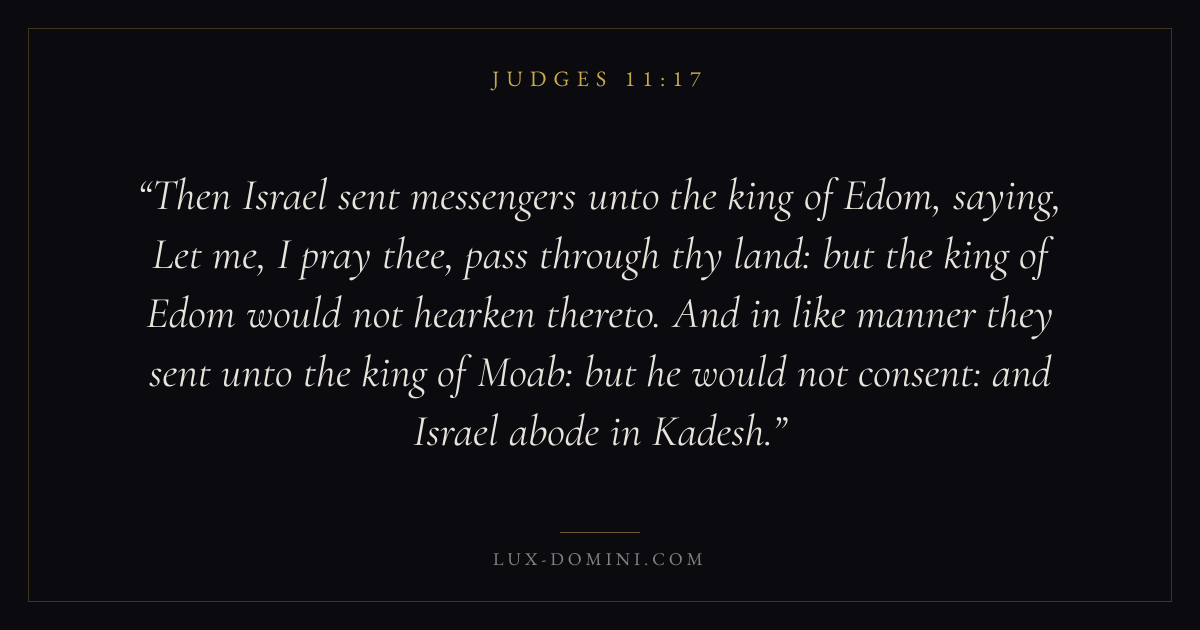 Then Israel sent messengers unto the king of Edom, saying, Let me, I pray thee, pass through thy land: but the king of Edom would not hearken thereto. And in like manner they sent unto the king of Moab: but he would not consent: and Israel abode in Kadesh.