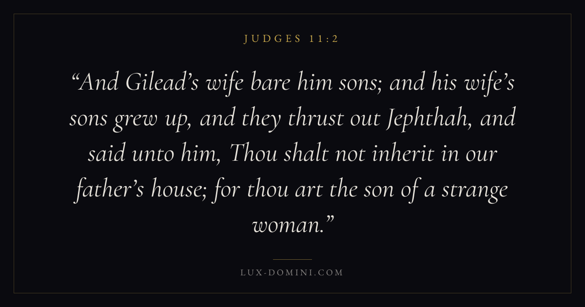 And Gilead’s wife bare him sons; and his wife’s sons grew up, and they thrust out Jephthah, and said unto him, Thou shalt not inherit in our father’s house; for thou art the son of a strange woman.