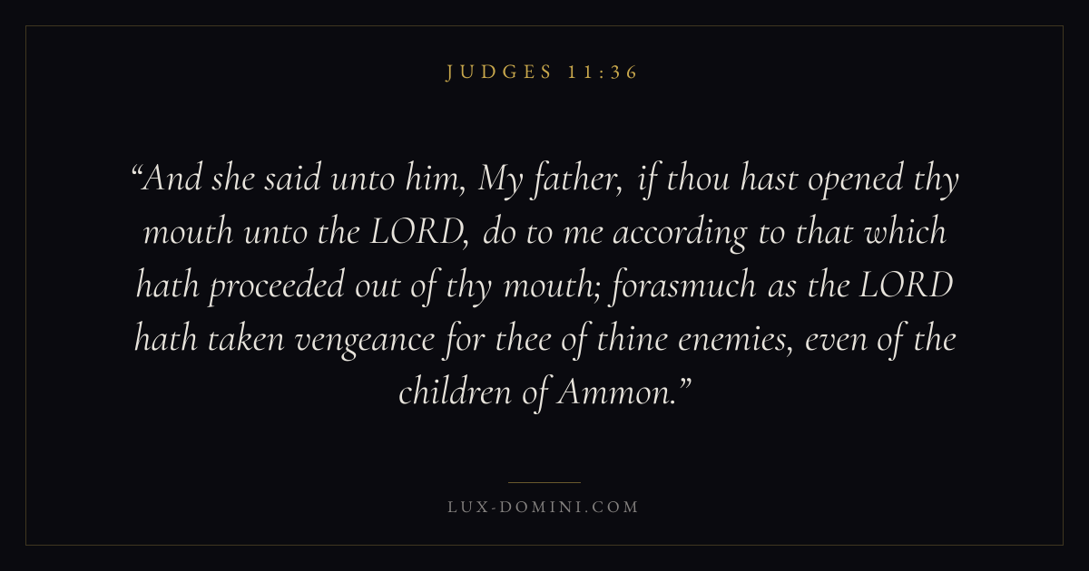 And she said unto him, My father, if thou hast opened thy mouth unto the LORD, do to me according to that which hath proceeded out of thy mouth; forasmuch as the LORD hath taken vengeance for thee of thine enemies, even of the children of Ammon.