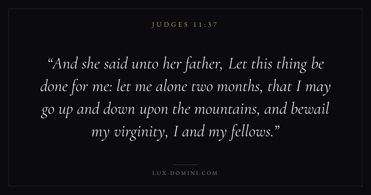 And she said unto her father, Let this thing be done for me: let me alone two months, that I may go up and down upon the mountains, and bewail my virginity, I and my fellows.