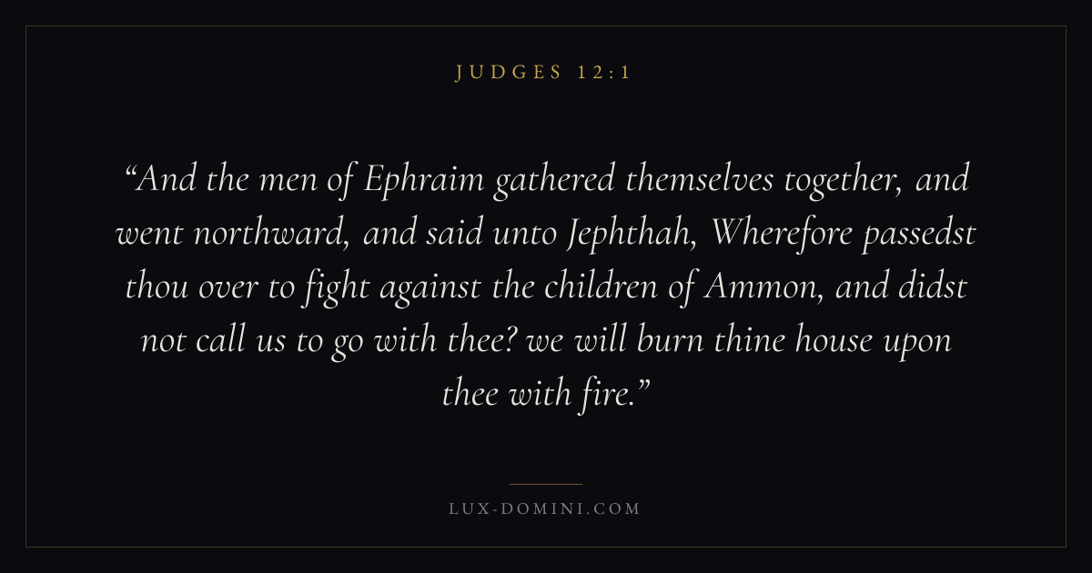And the men of Ephraim gathered themselves together, and went northward, and said unto Jephthah, Wherefore passedst thou over to fight against the children of Ammon, and didst not call us to go with thee? we will burn thine house upon thee with fire.