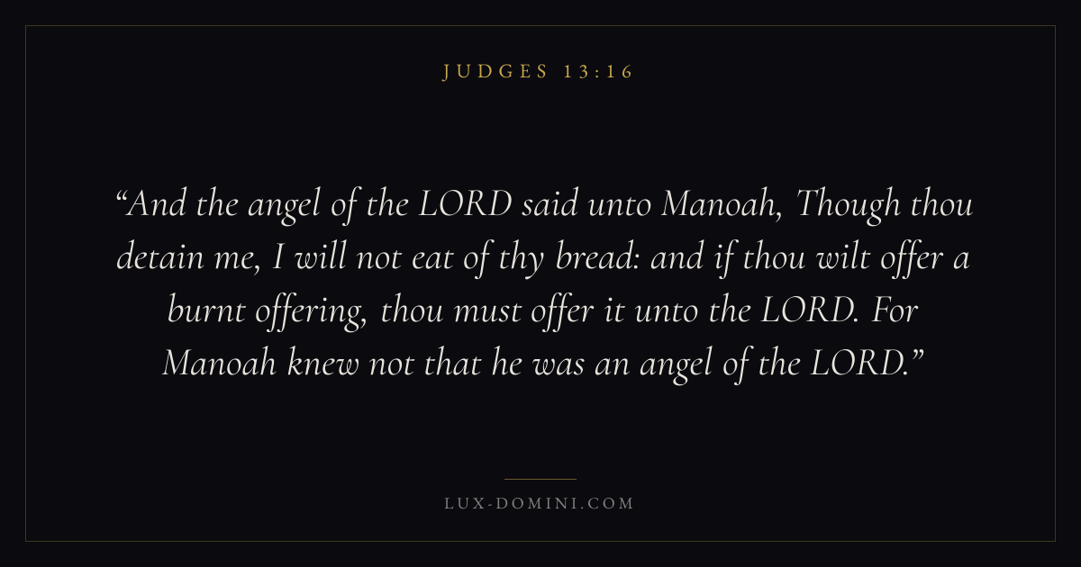 And the angel of the LORD said unto Manoah, Though thou detain me, I will not eat of thy bread: and if thou wilt offer a burnt offering, thou must offer it unto the LORD. For Manoah knew not that he was an angel of the LORD.