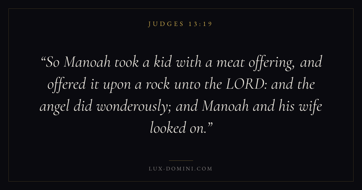 So Manoah took a kid with a meat offering, and offered it upon a rock unto the LORD: and the angel did wonderously; and Manoah and his wife looked on.