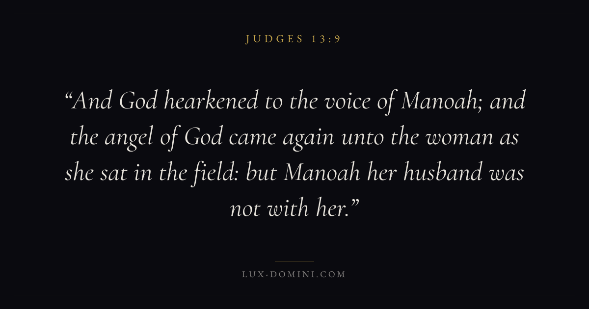 And God hearkened to the voice of Manoah; and the angel of God came again unto the woman as she sat in the field: but Manoah her husband was not with her.