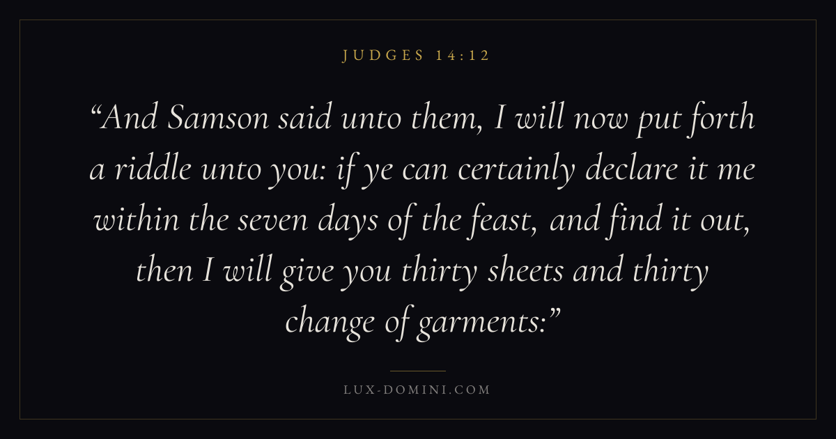 And Samson said unto them, I will now put forth a riddle unto you: if ye can certainly declare it me within the seven days of the feast, and find it out, then I will give you thirty sheets and thirty change of garments: