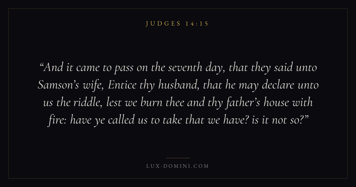 And it came to pass on the seventh day, that they said unto Samson’s wife, Entice thy husband, that he may declare unto us the riddle, lest we burn thee and thy father’s house with fire: have ye called us to take that we have? is it not so?
