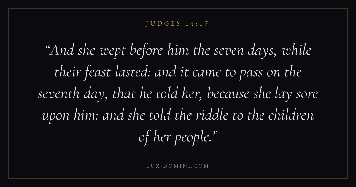 And she wept before him the seven days, while their feast lasted: and it came to pass on the seventh day, that he told her, because she lay sore upon him: and she told the riddle to the children of her people.