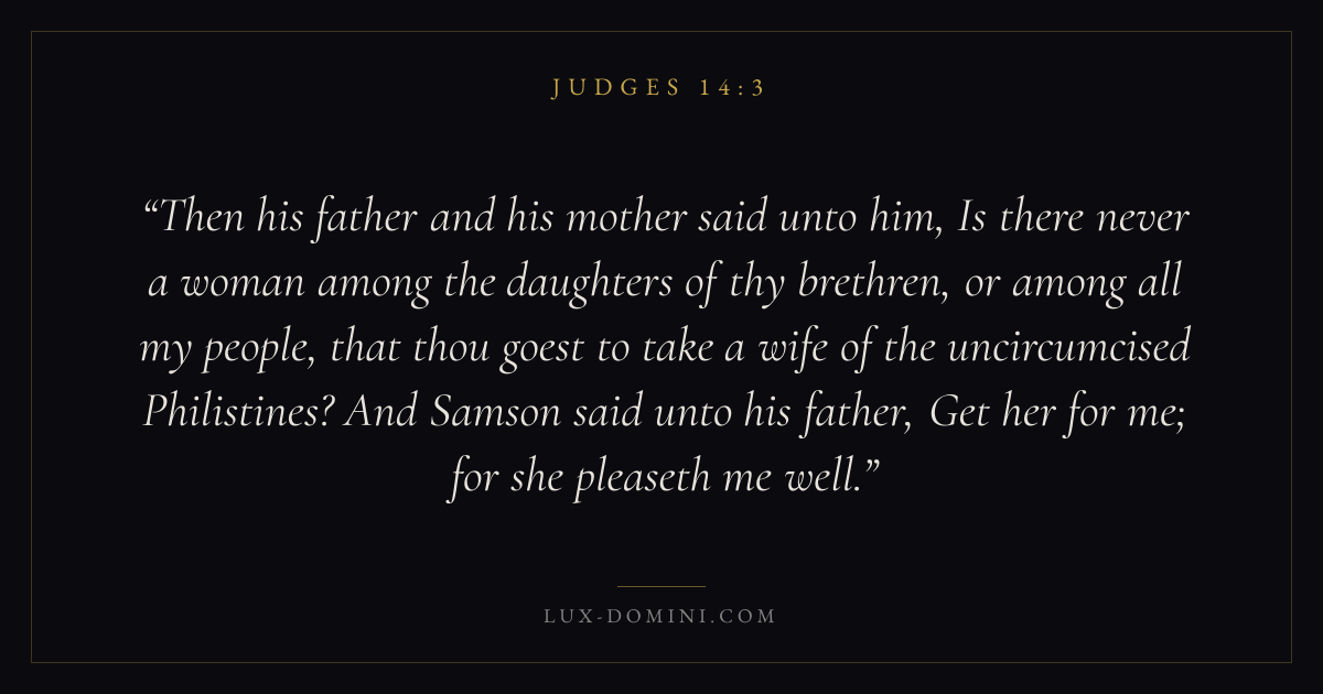 Then his father and his mother said unto him, Is there never a woman among the daughters of thy brethren, or among all my people, that thou goest to take a wife of the uncircumcised Philistines? And Samson said unto his father, Get her for me; for she pleaseth me well.