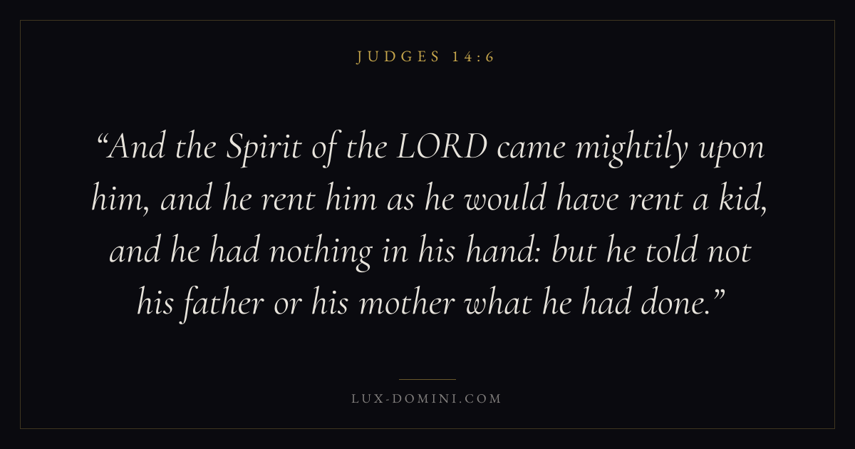 And the Spirit of the LORD came mightily upon him, and he rent him as he would have rent a kid, and he had nothing in his hand: but he told not his father or his mother what he had done.