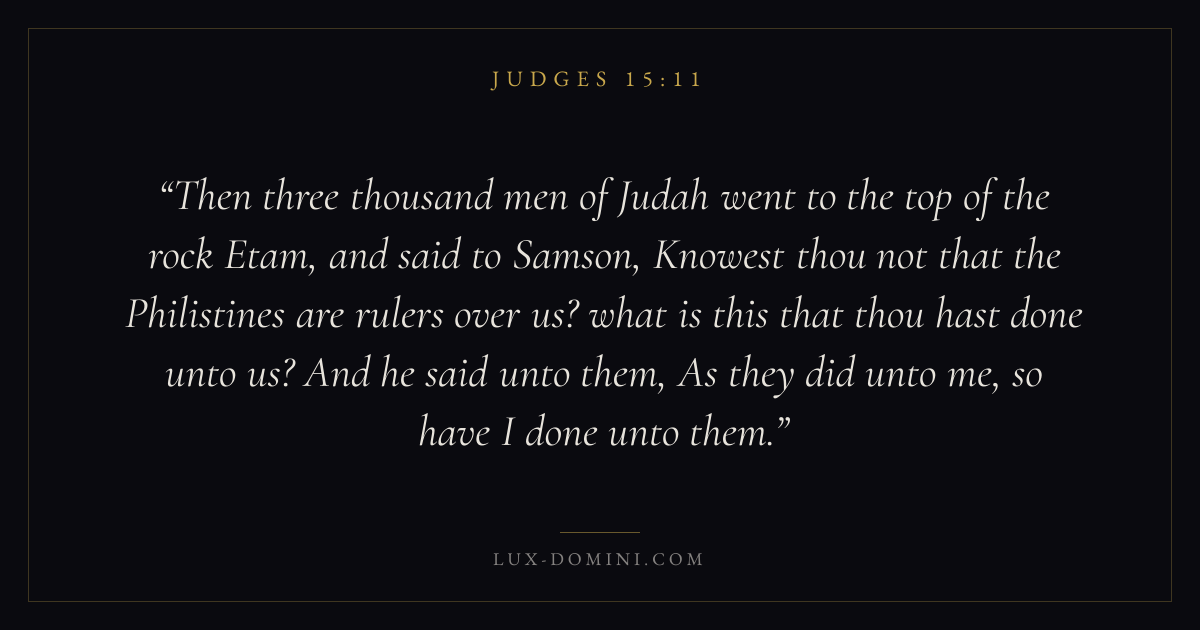 Then three thousand men of Judah went to the top of the rock Etam, and said to Samson, Knowest thou not that the Philistines are rulers over us? what is this that thou hast done unto us? And he said unto them, As they did unto me, so have I done unto them.