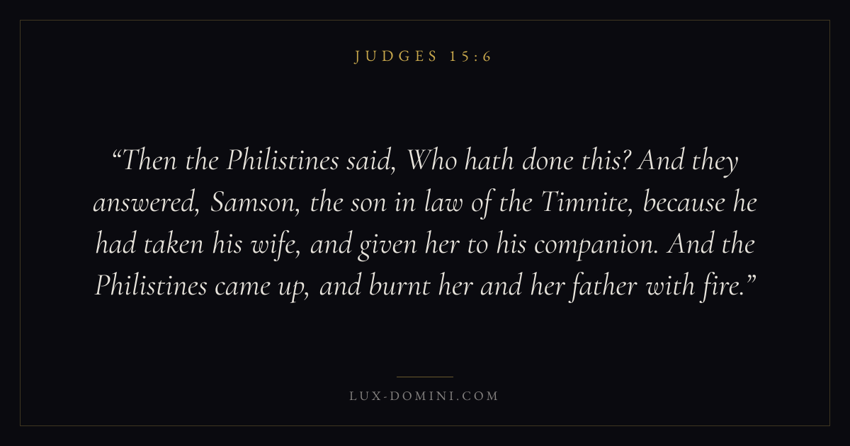 Then the Philistines said, Who hath done this? And they answered, Samson, the son in law of the Timnite, because he had taken his wife, and given her to his companion. And the Philistines came up, and burnt her and her father with fire.