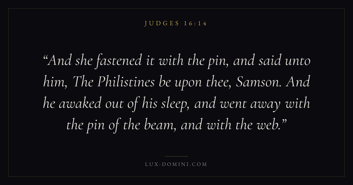 And she fastened it with the pin, and said unto him, The Philistines be upon thee, Samson. And he awaked out of his sleep, and went away with the pin of the beam, and with the web.