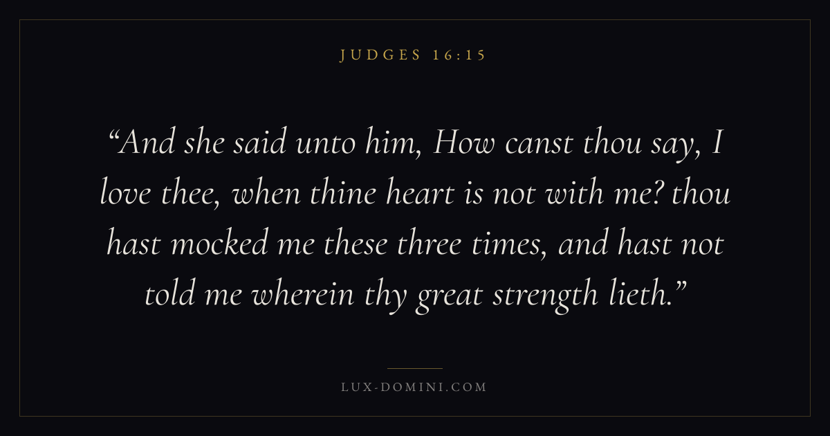 And she said unto him, How canst thou say, I love thee, when thine heart is not with me? thou hast mocked me these three times, and hast not told me wherein thy great strength lieth.