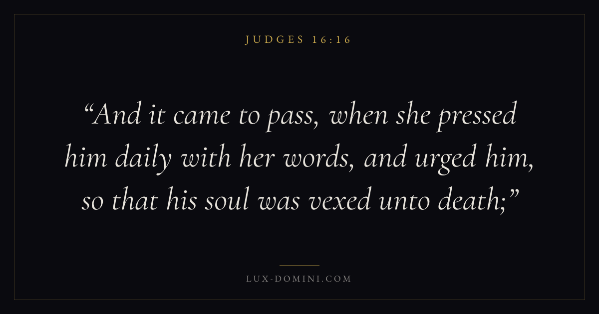 And it came to pass, when she pressed him daily with her words, and urged him, so that his soul was vexed unto death;