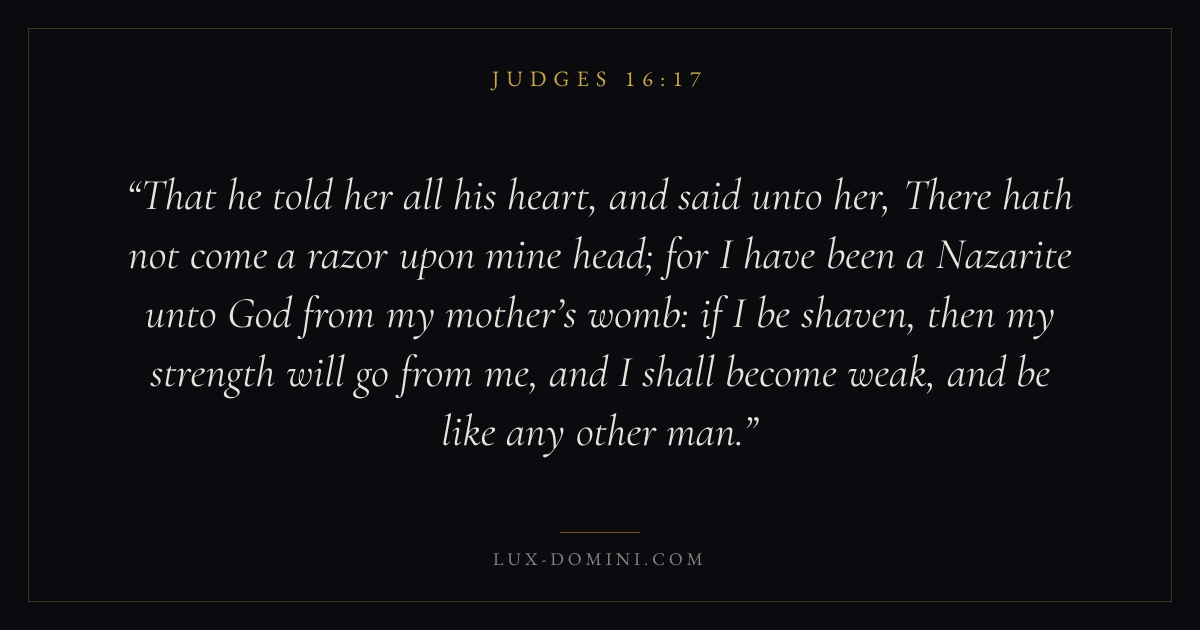 That he told her all his heart, and said unto her, There hath not come a razor upon mine head; for I have been a Nazarite unto God from my mother’s womb: if I be shaven, then my strength will go from me, and I shall become weak, and be like any other man.