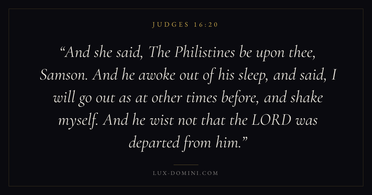 And she said, The Philistines be upon thee, Samson. And he awoke out of his sleep, and said, I will go out as at other times before, and shake myself. And he wist not that the LORD was departed from him.
