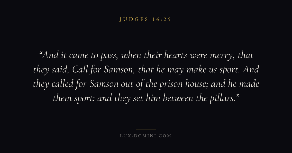 And it came to pass, when their hearts were merry, that they said, Call for Samson, that he may make us sport. And they called for Samson out of the prison house; and he made them sport: and they set him between the pillars.