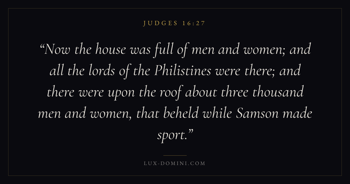 Now the house was full of men and women; and all the lords of the Philistines were there; and there were upon the roof about three thousand men and women, that beheld while Samson made sport.