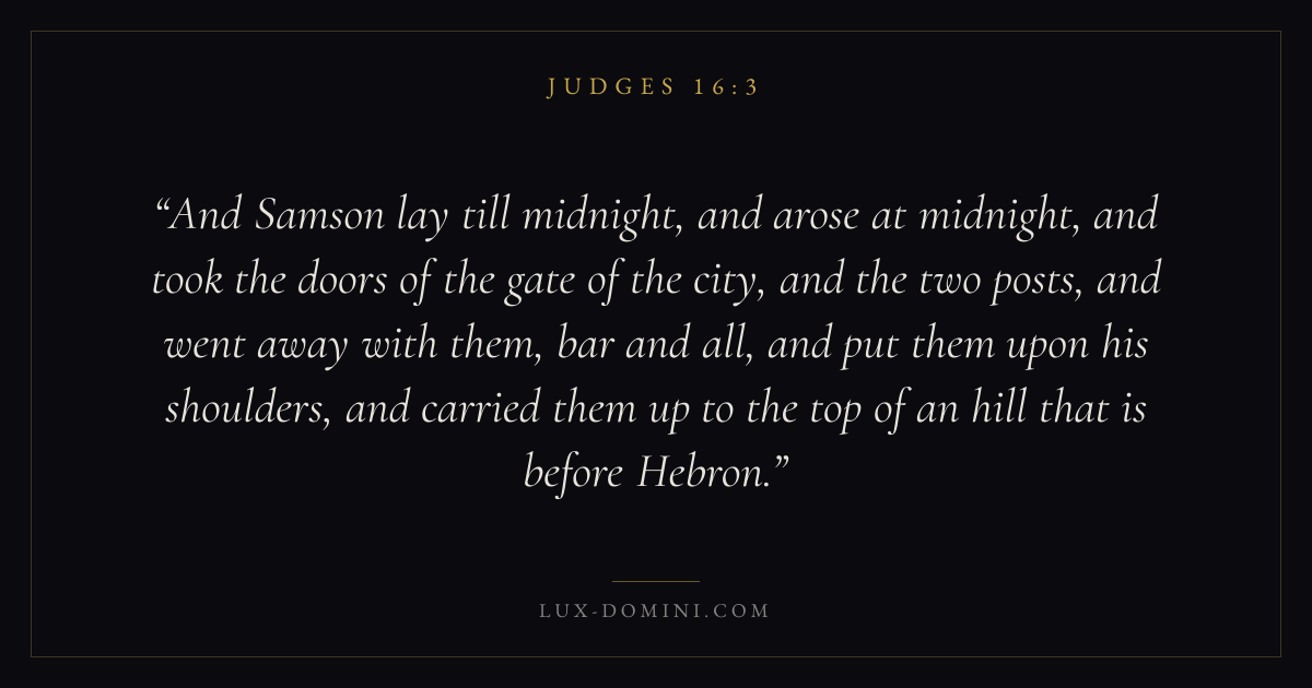 And Samson lay till midnight, and arose at midnight, and took the doors of the gate of the city, and the two posts, and went away with them, bar and all, and put them upon his shoulders, and carried them up to the top of an hill that is before Hebron.