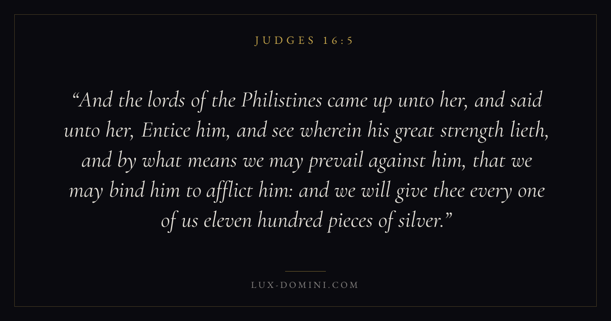 And the lords of the Philistines came up unto her, and said unto her, Entice him, and see wherein his great strength lieth, and by what means we may prevail against him, that we may bind him to afflict him: and we will give thee every one of us eleven hundred pieces of silver.