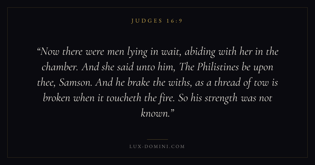 Now there were men lying in wait, abiding with her in the chamber. And she said unto him, The Philistines be upon thee, Samson. And he brake the withs, as a thread of tow is broken when it toucheth the fire. So his strength was not known.
