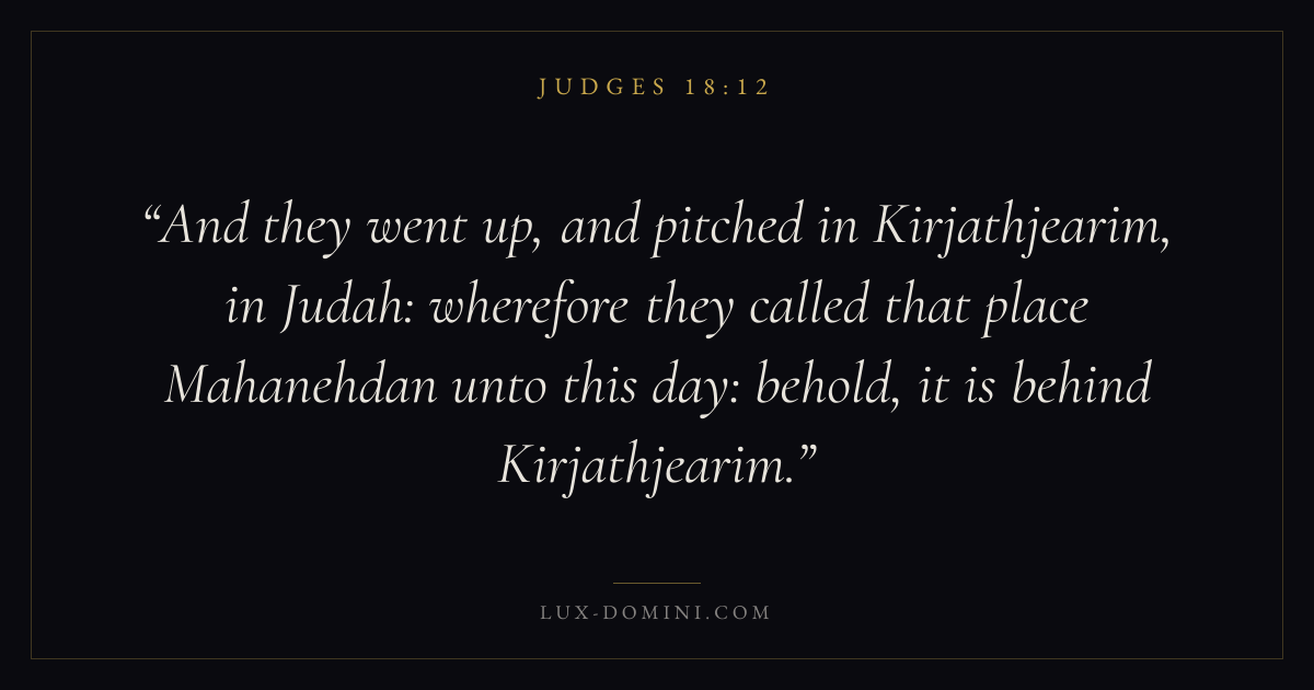 And they went up, and pitched in Kirjathjearim, in Judah: wherefore they called that place Mahanehdan unto this day: behold, it is behind Kirjathjearim.