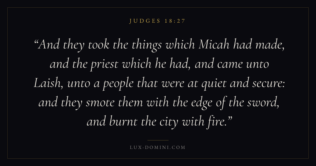 And they took the things which Micah had made, and the priest which he had, and came unto Laish, unto a people that were at quiet and secure: and they smote them with the edge of the sword, and burnt the city with fire.