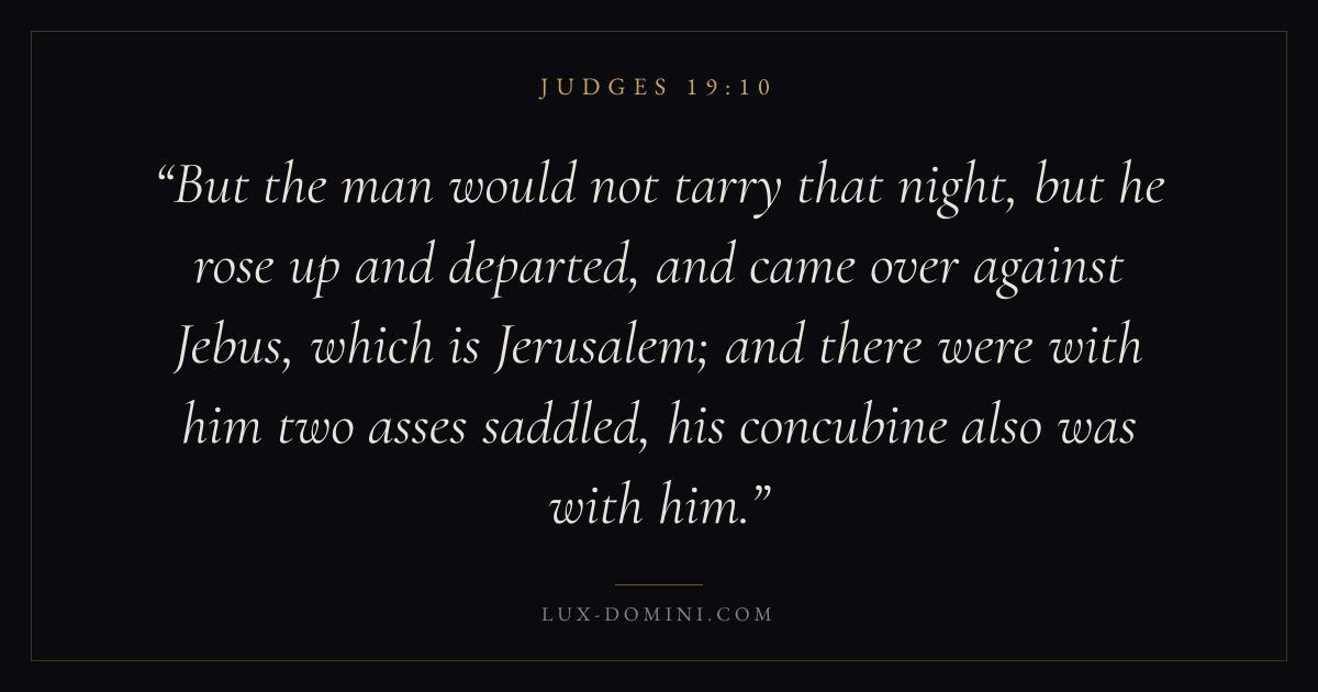 But the man would not tarry that night, but he rose up and departed, and came over against Jebus, which is Jerusalem; and there were with him two asses saddled, his concubine also was with him.