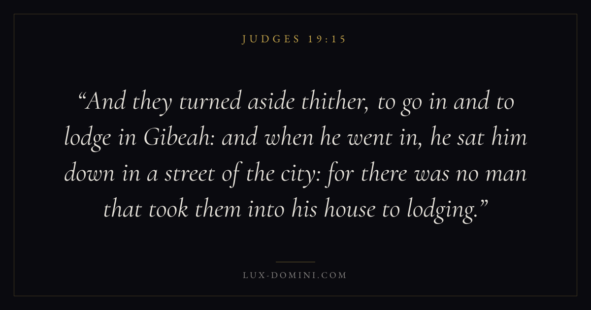 And they turned aside thither, to go in and to lodge in Gibeah: and when he went in, he sat him down in a street of the city: for there was no man that took them into his house to lodging.