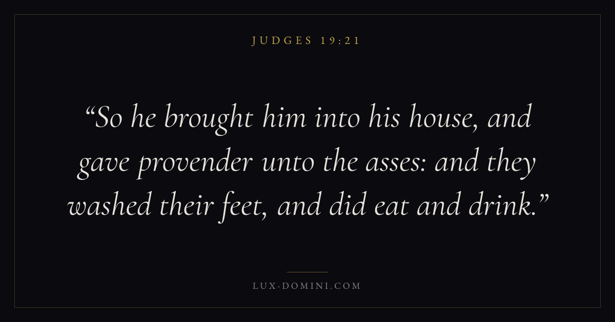 So he brought him into his house, and gave provender unto the asses: and they washed their feet, and did eat and drink.
