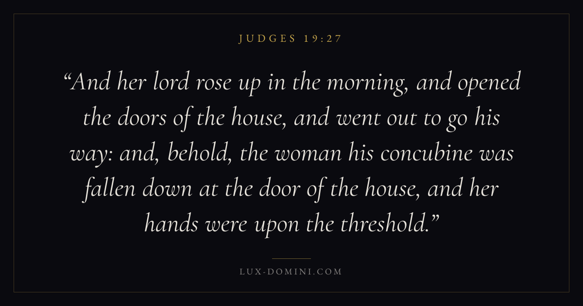And her lord rose up in the morning, and opened the doors of the house, and went out to go his way: and, behold, the woman his concubine was fallen down at the door of the house, and her hands were upon the threshold.