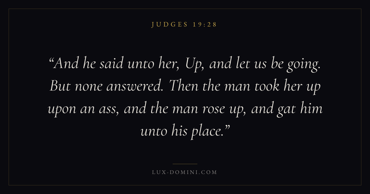 And he said unto her, Up, and let us be going. But none answered. Then the man took her up upon an ass, and the man rose up, and gat him unto his place.