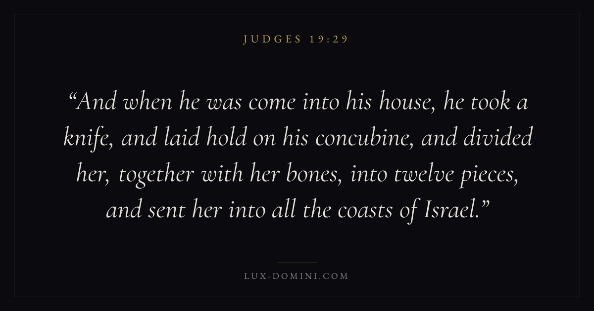 And when he was come into his house, he took a knife, and laid hold on his concubine, and divided her, together with her bones, into twelve pieces, and sent her into all the coasts of Israel.
