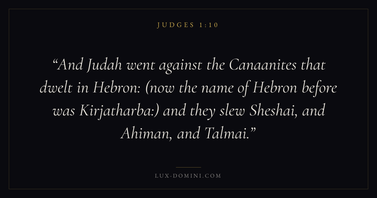 And Judah went against the Canaanites that dwelt in Hebron: (now the name of Hebron before was Kirjatharba:) and they slew Sheshai, and Ahiman, and Talmai.